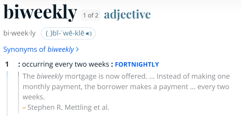 You clear your throat and ask, “Biweekly? As in every two weeks or twice a week?”